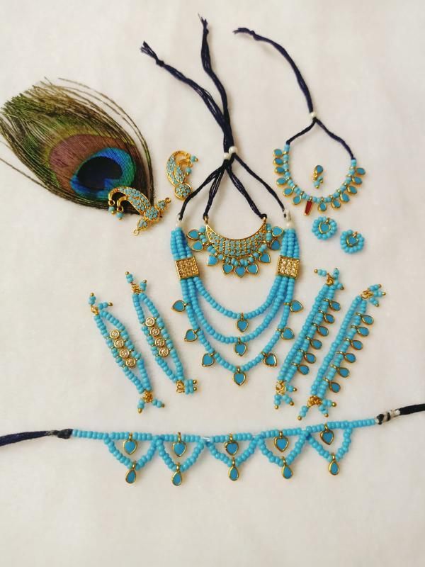 Adorn Laddu Gopal Ji  with this blue beads complete shringar set including necklace, mala, bangles, bansuri jewelry and morpankh, perfect for festive and daily seva.