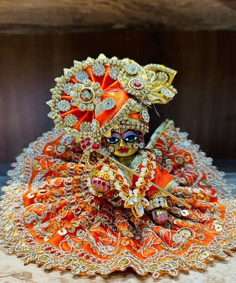 This richly embroidered orange poshak is designed to give Laddu Gopal ji a festive and royal look. The detailed zari work, layered jewellery styling, and ornate headgear reflect traditional temple dressing. Perfect for Janmashtami, utsav seva, and special darshan days, this poshak adds vibrancy and devotion to your mandir.