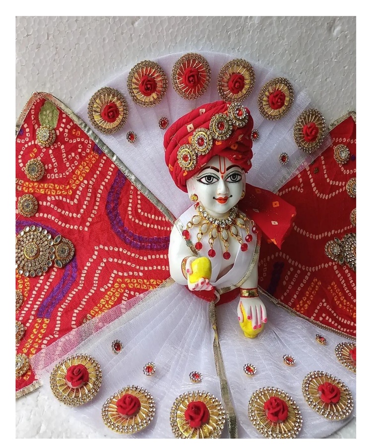 This red and white designer shringar dress features a beautifully crafted back fan that adds grandeur to Laddu Gopal Ji’s appearance. Its rich detailing and festive color theme make it an excellent choice for special celebrations and decorative setups.