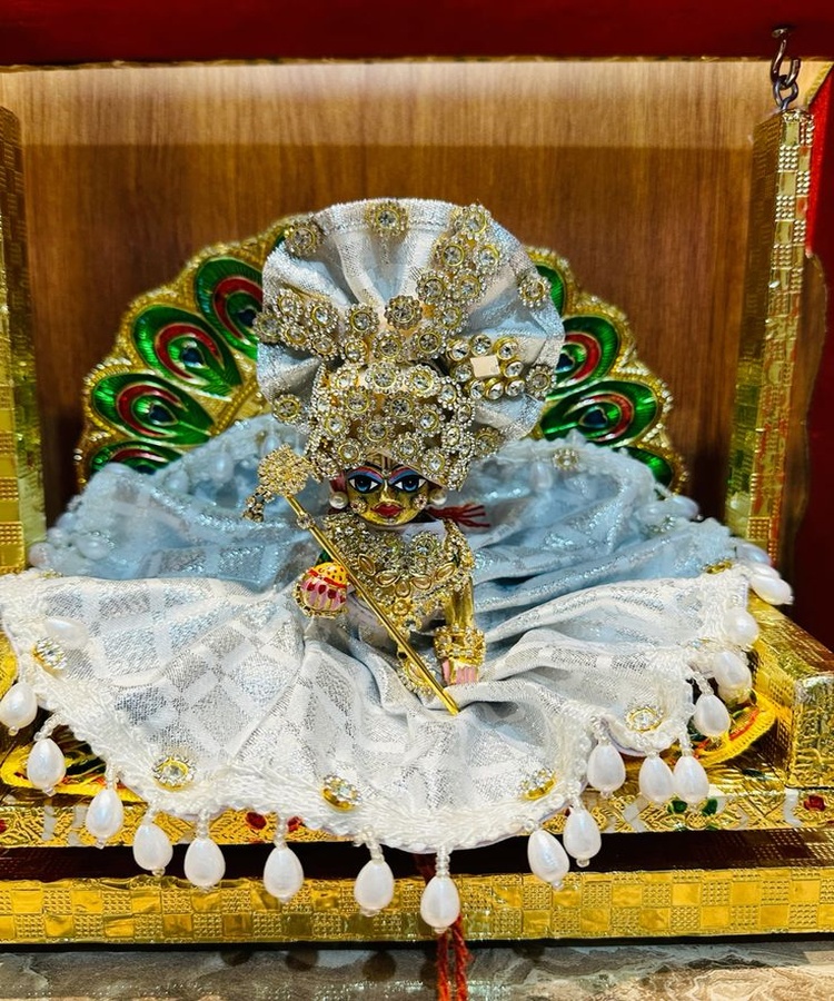 This silver white shringar dress offers a serene yet royal look for Laddu Gopal Ji. The pearl drops, refined detailing, and elegant design make it suitable for temple décor, festive pooja, and special devotional setups.
