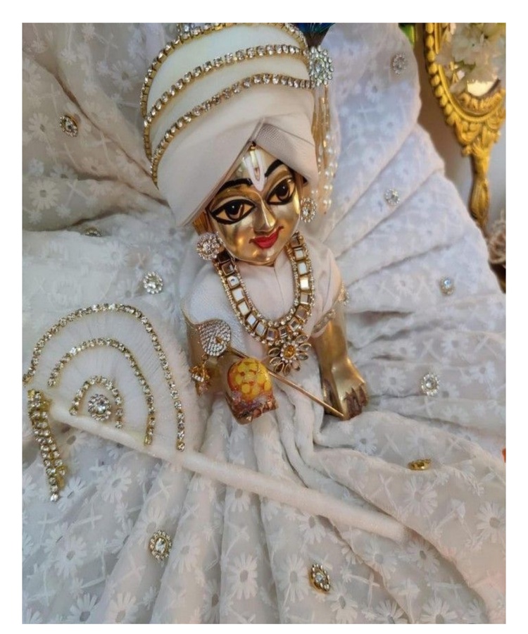 This white seva poshak is designed for devotees who prefer simplicity and purity. The soft fabric and subtle stone work create a peaceful and devotional appearance. Perfect for daily worship, Ekadashi, and calm seva routines, this dress ensures comfort while maintaining spiritual elegance.