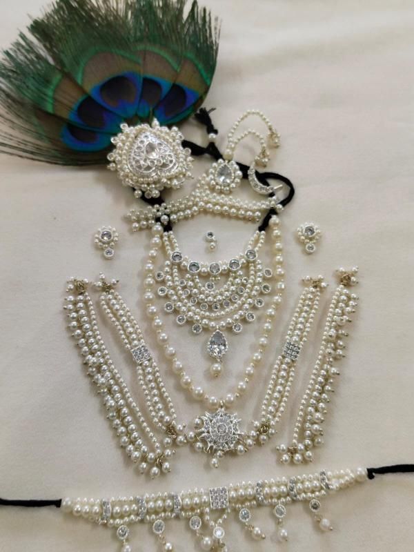 This White Pearl Complete Shringar Set is a timeless and graceful devotional jewelry set designed to enhance the pure and divine appearance of Laddu Gopal Ji . Crafted with soft white pearls, sparkling stones, and a natural peacock feather (morpankh), this set reflects simplicity, devotion, and spiritual beauty.